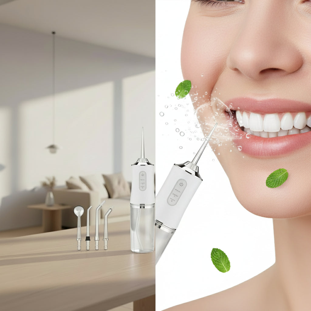 Este irrigador oral va más allá del cepillado, llegando a áreas difíciles entre los dientes y bajo la línea de las encías, eliminando la placa y bacterias que se acumulan en cada rincón. ¿Te gustaría sentir tu boca limpia y fresca en profundidad?